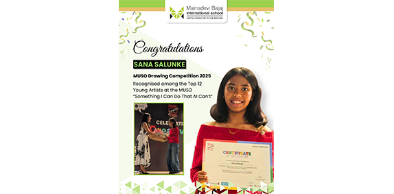 Proud Moment for Mainadevi Bajaj International School! The Museum of Solutions (MUSO), Worli, organised a drawing competition on 11th October 2025 on the inspiring theme “Something I can do that AI can’t.” Out of 565 talented participants, only 12 were selected as awardees — and Sana, our very own student, was one of them! Her creativity and originality shone through, earning her a well-deserved award presented by ART INDIA. Congratulations, Sana! ✨ You make Mainadevi Bajaj International School truly proud.