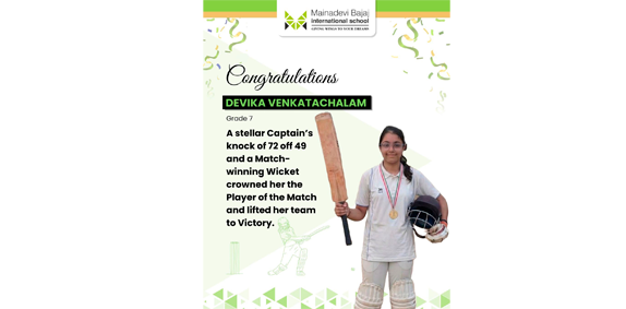 Rising Cricket Star in the Making! Devika, Grade 7, led MYCA to a championship win in the Celestia–Raigad Tournament. In the finals, she shone with 72 runs off 49 balls, took a key wicket, and earned the Player of the Match title—lifting the trophy for her team. MBIS is proud of you, Devika!