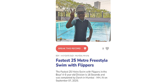 Darsh Malhotra, Grade 1 MBIS, has been recognized as a Kids World Record Holder for completing the Fastest 25 Meter Freestyle Swim with Flippers (Boys 4–6 Years) in 16 seconds, held in Mumbai. MBIS is proud of you Darsh!